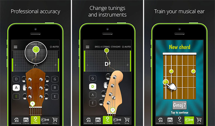 Guitartunaは、ギター、ウクレレ、ベース、その他の有名な楽器の最高のチューナーの1つです。このアプリは、エレクトリックおよびアコースティックギターやその他の弦楽器で動作します。必要に応じて、あらゆるテンポに設定できます。ビートを手動で調整したり、好みの速度で設定したりできます。スキルを向上させるために、12弦、7弦、Drop-Dなどの100を超えるチューニングが準備されています。