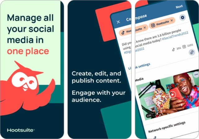 これは、いつでもどこでも視聴者と作成、スケジュール、計画、公開、監視し、関与する必要があるデジタルマーケティング担当者向けのもう1つの重要なアプリです。これにより、コンテンツの作成と投稿、ドラフトの編集、すべてのソーシャルメディアプロファイルのものを簡単にスケジュールできます。