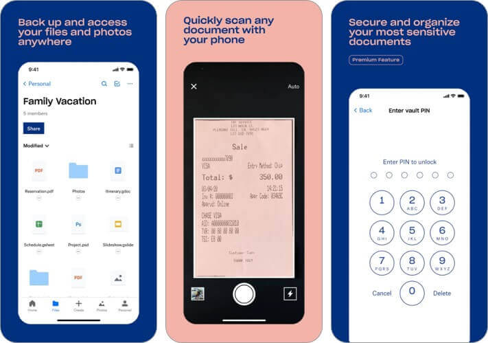 Dropboxは、クラウドにアップロードすることで、ファイルを常に便利に保つ最も簡単な方法で授与されます。保管に加えて、同僚、パートナー、クライアントと共有することもできます。このアプリを使用すると、大きなファイル、スキャンドキュメント、ID、領収書、写真などを共有できます。さらに、Dropboxを使用すると、オフラインであっても、任意のファイル形式にアクセスできます。追加のソフトウェアは必要なく、175を超えるファイルタイプをサポートします。かなり便利ですよね?
