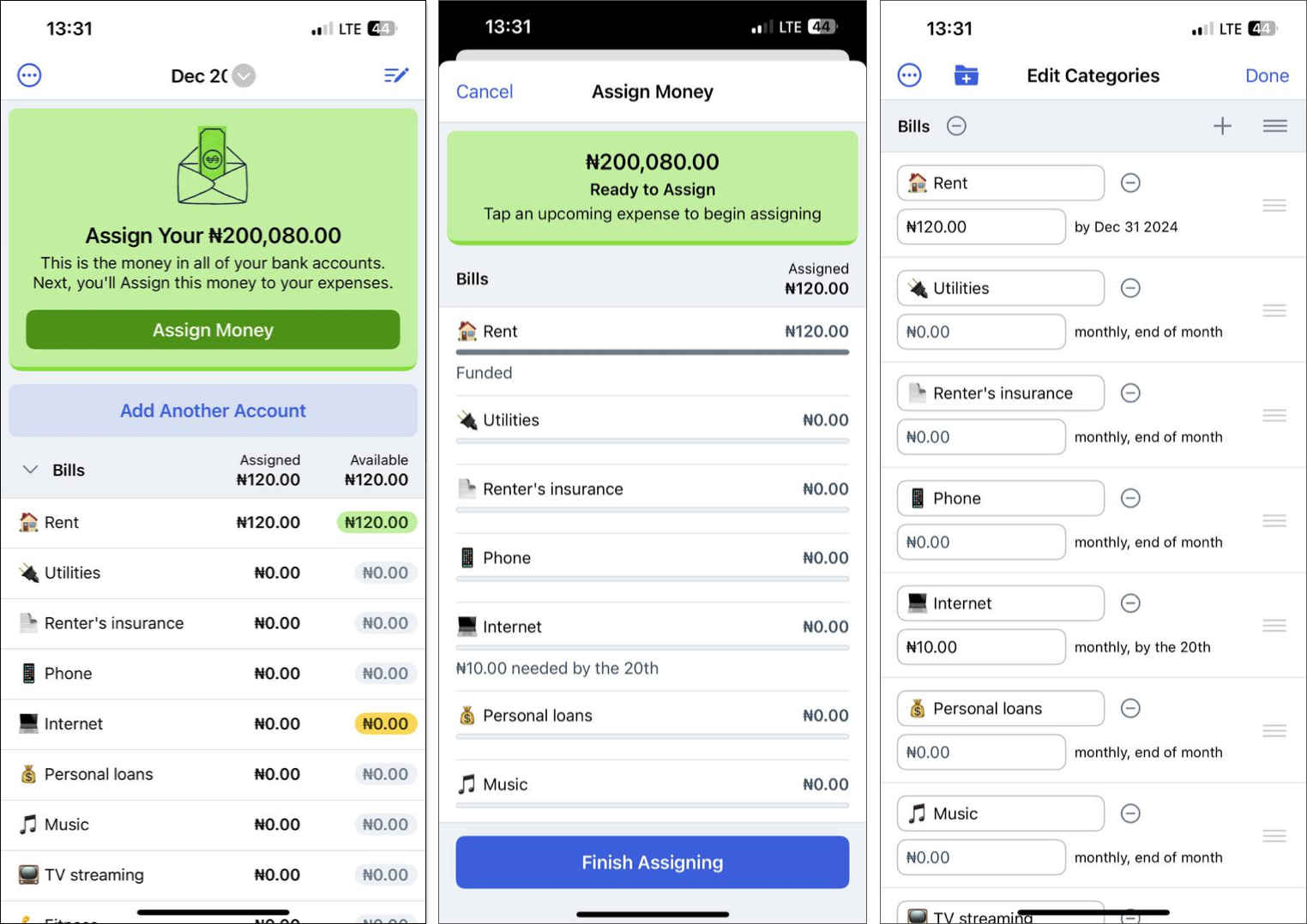 各カテゴリアイテムのターゲットを設定し、銀行口座をリンクしてバランスを自動的にキャプチャするか、バランスを手動で入力して予算項目に資金を割り当てることができます。