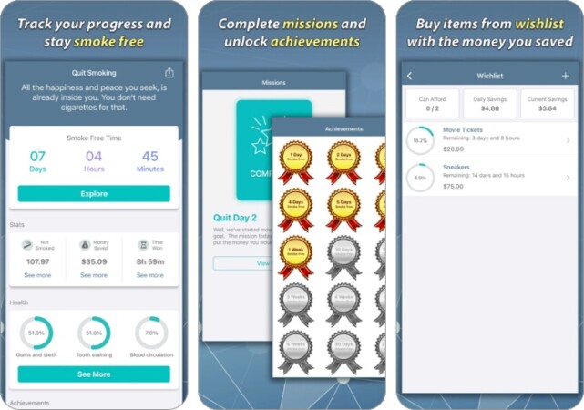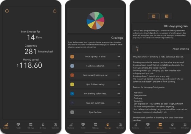 喫煙をやめると、タバコを完全に止めるのを助けるために、100日間の専用プログラムで援助を受けます。このアプリはシンプルですが、中毒を軽減し、最終的にそれを一掃するのに役立つさまざまな心理社会的ツールを提供します。そして、あなたの成果のためのはしけを手渡す賞のセクションがあります。