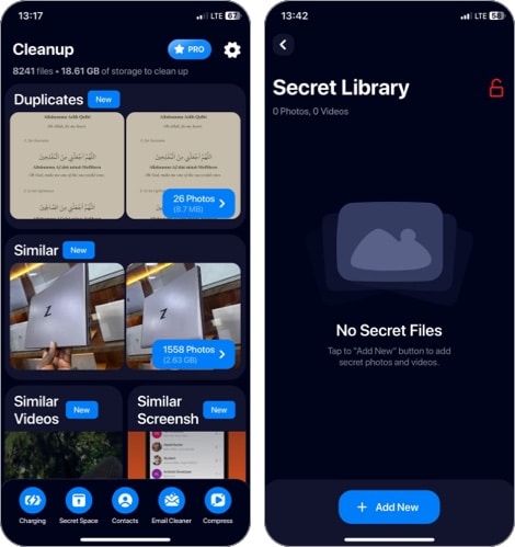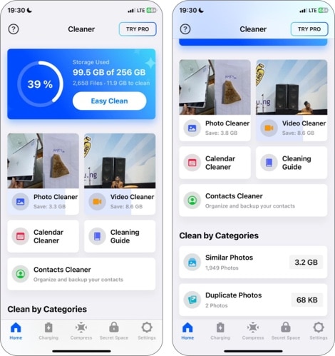 クリーナー - 無料のストレージアプリには、写真やビデオを隠すための秘密のスペースと、大きなメディアファイルを圧縮するためのツールも含まれています。