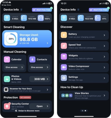 クリーンアップストレージ - Cleaner Kitは、デバイス上のメディアファイルを効率的に管理および整理するのに役立つ強力なiPhoneクリーニングアプリです。アプリを起動すると、すべてのクリーニング機能がすぐにアクセスできます。これらには、スマートクリーニング、手動クリーニング(写真/ビデオ、連絡先、カレンダー用)、ダウンロード速度、CPU使用、RAMの使用を表示するデバイス情報オプションが含まれます。