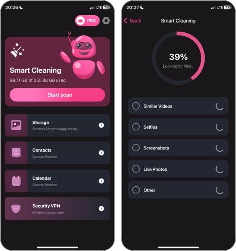 Cleanは、ユーザーフレンドリーなエクスペリエンスのおかげで、トップのiPhoneクリーナーアプリとして簡単に際立っています。アプリの着陸スクリーンでは、その自動スキャナーは重複したファイルとビデオを効果的に分類するため、デバイスを整理するのが簡単です。