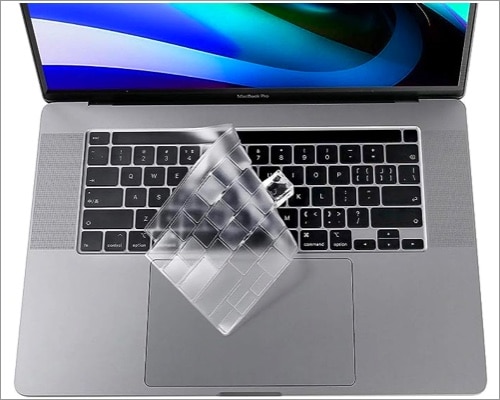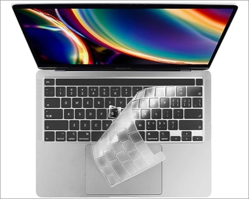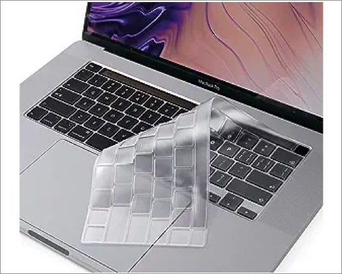 キーボードプロテクターの厚さは0.12mmで、指が干渉を感じることなくキーを迅速に滑ることができるようにします。さらに、カバーの透明な外観は、MacBookキーボードと簡単にブレンドし、キーボードのバックライトを中断しません。タッチIDの特定のカットアウトは、大文字によるこの優れたキーボードカバーの拍手に値する機能です。