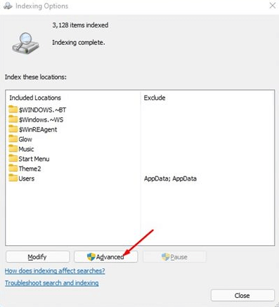 ステップ4。インデックス作成オプションプロンプトから[Advanced]を選択します。