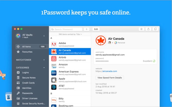 Mac Password Managerの支払いをいとわない場合、1Password 7よりも優れている人はほとんどいません。このパスワードマネージャーアプリの膨大な数の機能が価格設定を正当化します。アプリは、必要に応じて強力で一意のパスワードを生成します。