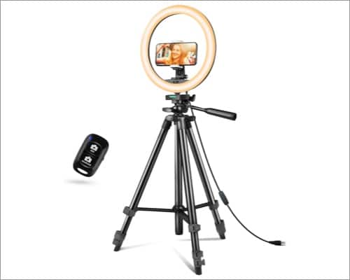 リングライトは、スレッド可能な底部を介して三脚スタンドに取り付けられ、360度回転できます。また、すべてのiPhoneモデルとAndroidモデルと互換性のある回転可能な電話ホルダーがあり、携帯電話を垂直または水平に保持できます。リングライトの後退の1つは、動作するために電源が必要であることです。充電できればもっと良かったでしょう。この製品には、iPhoneと互換性のあるワイヤレスBluetoothリモートシャッターがあり、携帯電話に触れずにショットを撮ることができます。