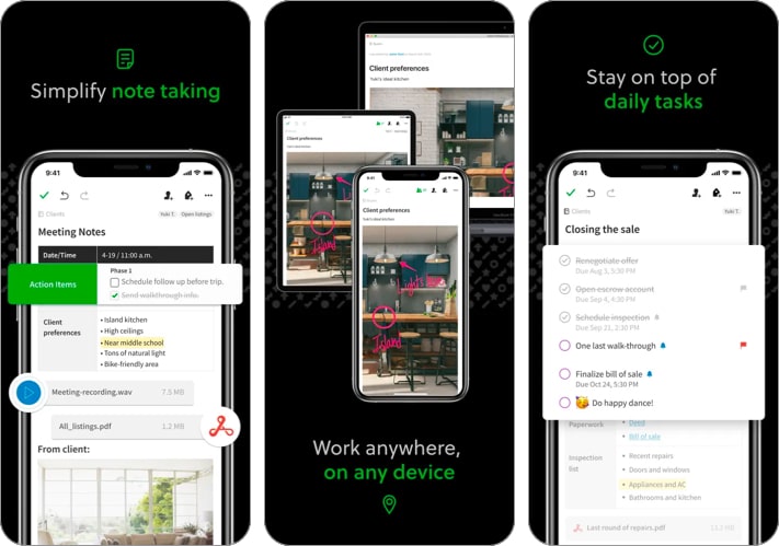 このアプリを使用すると、テキスト、スケッチ、写真、オーディオ、ビデオ、PDF、Webクリップ、Webクリッピングなど、いくつかの形式でメモを取ることができます。iPhoneカメラを使用して、ドキュメント、名刺、図面、手書きのメモをスキャンできます。また、画像に注釈を付けることもできます。パスコードを使用して、アカウントにより多くのセキュリティを提供できます。