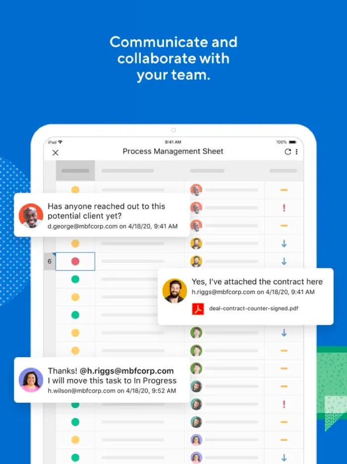 譲受人、期日、フォロワー、チェックリスト、前身、ファイルをタスクに追加することで、生産性を向上させることができます。その上、チームは共有されたスプレッドシートについてコラボレーション、編集、コメントできます。最良の部分は、アップデートと承認の自動リクエストを送信して、作業をスピードアップして時間を節約することです。
