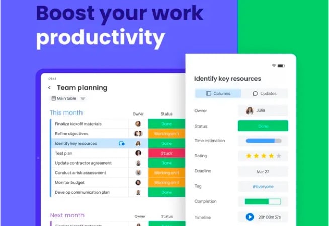 Monday.comは中央の作業ハブとして機能し、チームメイトを最新の状態に保つためのリアルタイムの更新を提供します。事前に作られたテンプレートを使用して簡単にセットアップし、プロジェクト管理プロセスを適応させ、好みのツールと統合できます。プロジェクト計画のためにかんばん、タイムライン、またはチャートを使用すると、各タスクの時間と進行を簡単に追跡できます。