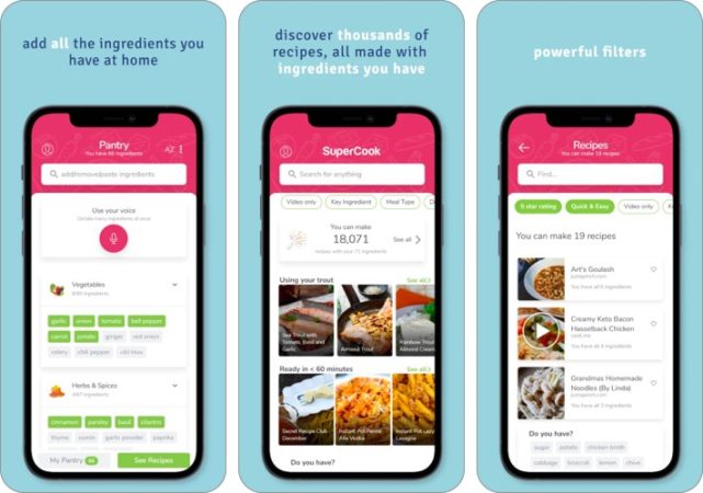 開始するには、アプリのパントリーページに移動し、2000を超えるリストから持っているすべての材料を選択します。カテゴリには、果物、野菜、肉、オイル、ソース、スパイスなどが含まれます。その後、SuperCookは、材料に合った完璧なレシピをキュレーションすることで、魔法をかけます。