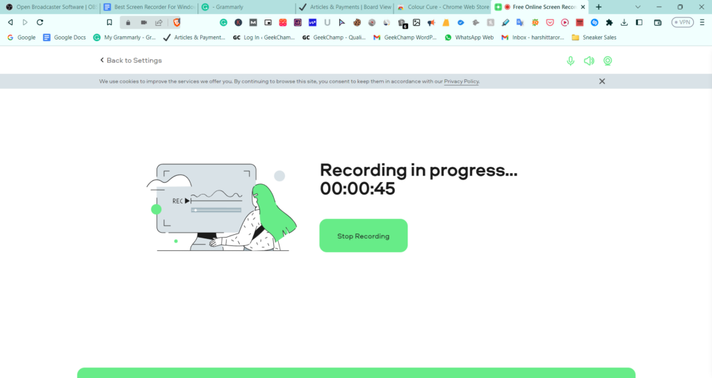 無料のオンラインスクリーンレコーダーですが。それはまだあなたを許します画面録音に顔を含めてくださいあなたのウェブカメラ経由。これだけでなく、マイクを含むシステムのサウンドでビデオを録画することもできます。今、その制限に近づいています。