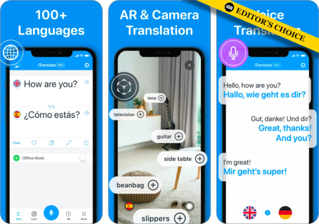 最も人気のある翻訳アプリの1つであるItranslateは、サポートされている100を超える言語で単語、フレーズ、テキストを翻訳できます。男性と女性の両方の声で翻訳を聴くことができます。異なる方言を切り替えます。