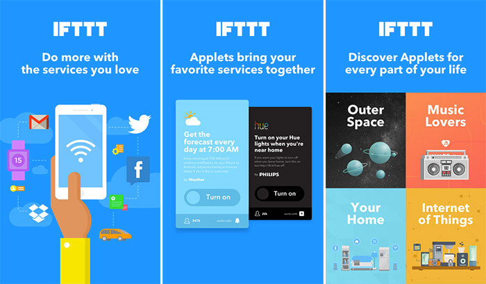 IFTTTでデジタルライフを自動化することができます。つまり、「もしそうなら」を意味します。そして、この式は、モノのインターネットの台頭の前にありました。このアプリは、オンラインライフを自動化するための簡単なレシピを提供します。たとえば、すべてのツイートをEvernoteに保存したい場合は、それに応じてレシピを作成してください。お気に入りのツイートはすべてそこに保存されます。その他の人気のあるレシピは次のとおりです。すべてのInstagramsをTwitterの写真として投稿し、地元の食料品店にいるときはメッセージルームメイト、TumblrまたはTwitterでFBステータスの更新を共有し、YouTubeやVimeoでブログや他の無数のレシピに好きなビデオをアップロードします。