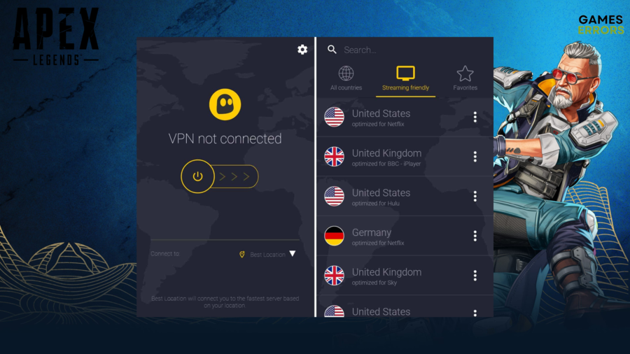 Apex Legends VPNを設定する前に、あなたの必需品とそれを使用するものについて考えてください。遅延なしで最高の接続速度を取得しようとしている場合は、ローカルサーバーを使用してください。別の地域で使用する場合は、公式ゲームサーバーに最も近いVPNサーバーを選択します。以下の手順に従ってください