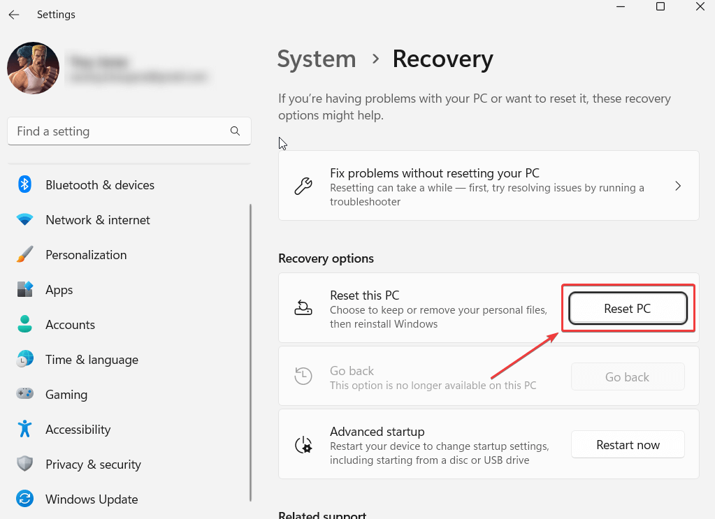 ステップ3 - 下回復オプション、クリックしてくださいPCをリセットします画面上の指示に従ってください。