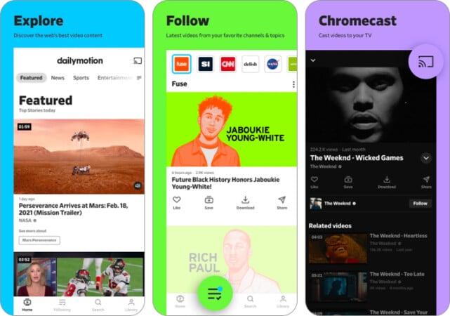 Dailymotionは10年以上前から存在しています。 iOSアプリは、滑らかなユーザーインターフェイスに感銘を受けました。 YouTubeに著しく似ています。ビデオは、特集(今日のトップストーリー)、ニュース、エンターテイメント、音楽セクションに分かれています。また、検索オプションを使用して探しているビデオを検索することもできます。