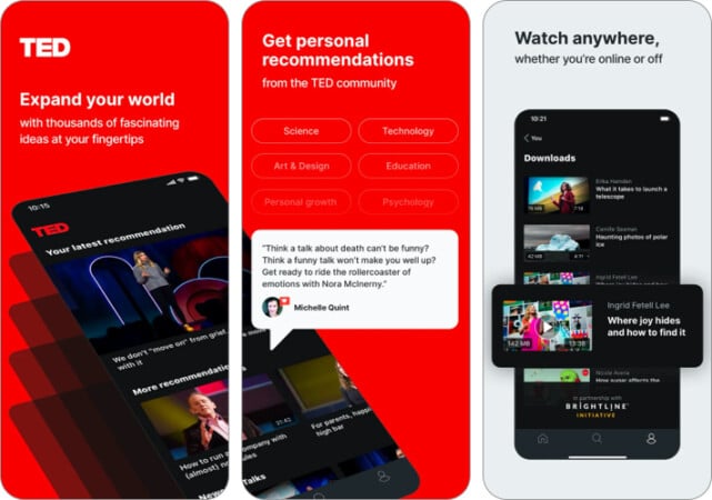 推奨の正確性は驚くべきものです。テッドお勧めします機能は、私たちの興味に基づいて関連するビデオを自動的にキュレートします。最後に、オフラインアクセスのためにビデオやポッドキャストをダウンロードできます。