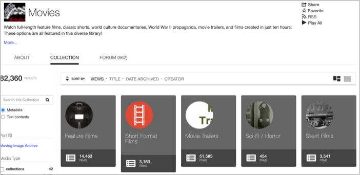 インターネットアーカイブの強力な検索機能に徹底的に感銘を受けました。タイプ、年、トピック、作成者、言語に基づいて映画/ビデオを選択できます。