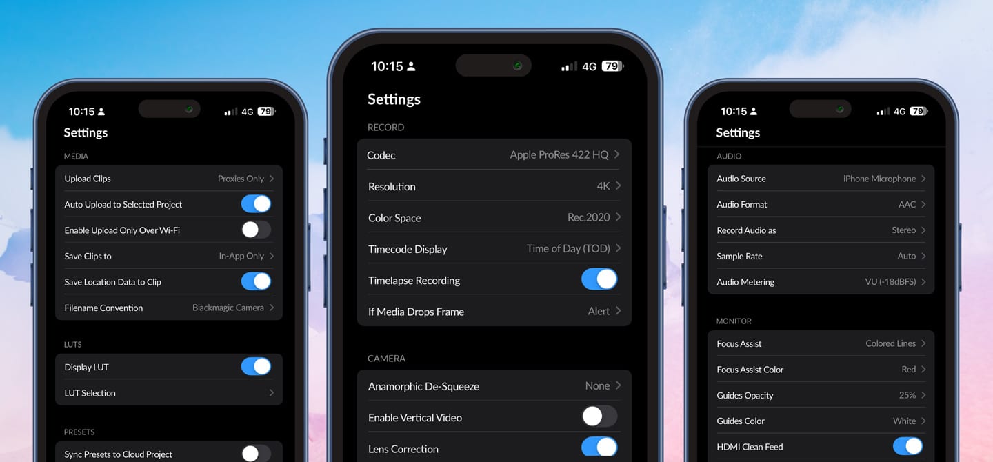 BlackMagicカメラアプリは、基本的なコントロールで停止しません。また、監視、オーディオ、カメラのセットアップ、録音のための高度な設定も提供します。ユーザーは、アナモルフィックデスキーズおよびレンズ補正設定を微調整し、VUやPPMオーディオメーター、AAC、IEEEフロート、PCM形式などのプロフェッショナルなオーディオオプションを選択できます。