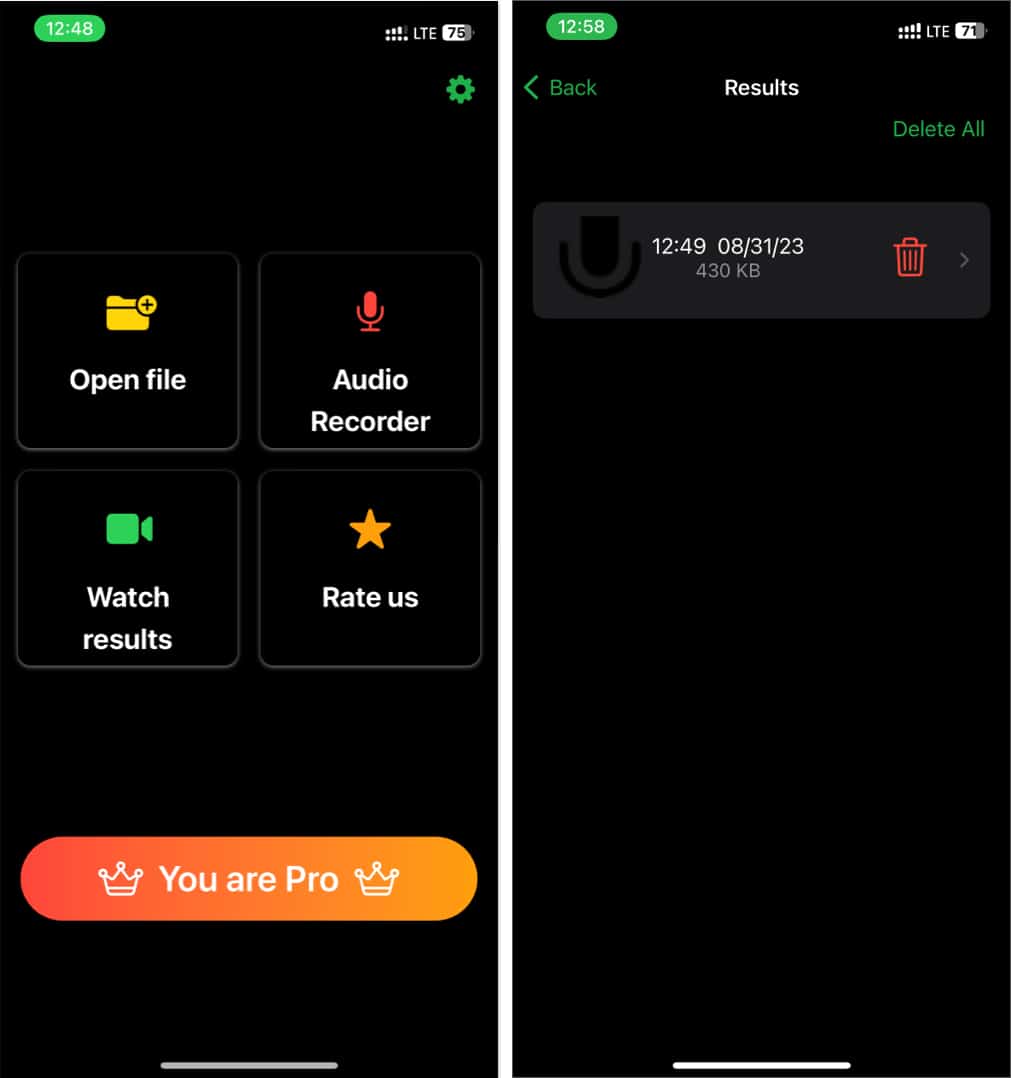 オープンファイルとレートUSオプションは自明ですが、オーディオレコーダーを使用すると、iPhoneまたはiPadにオーディオを録画でき、Watch Resultsオプションには過去の録音の結果が表示されます。