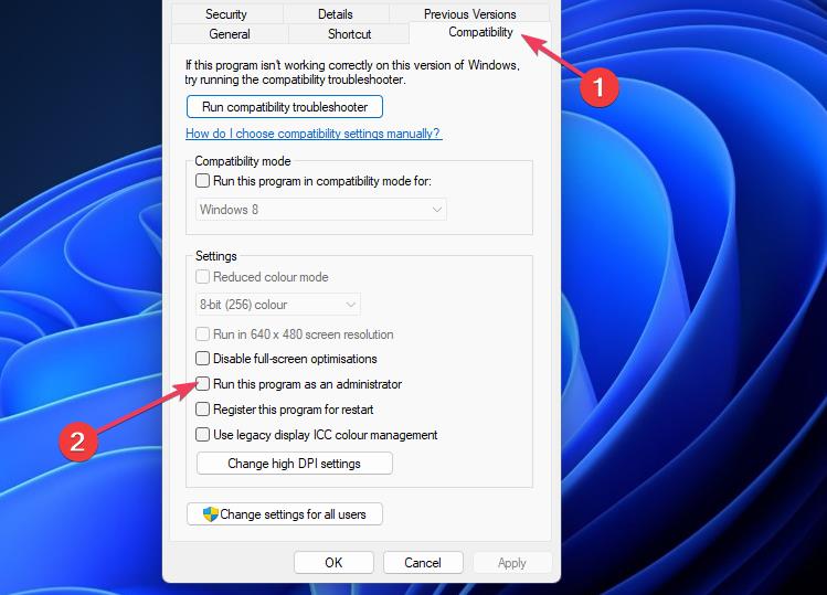 2. プロパティウィンドウ、[互換性]タブに移動し、選択しますフルスクリーンの最適化を無効にし、DPI設定の変更を押します。ボタンを押します。