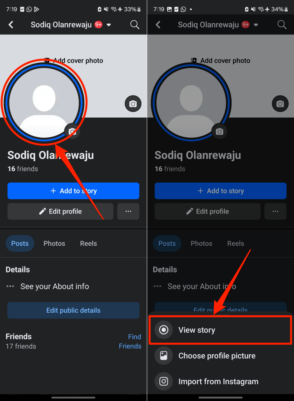 - Facebookプロフィールページを開き、タップしますプロフィール写真、および選択しますストーリーを見る。
