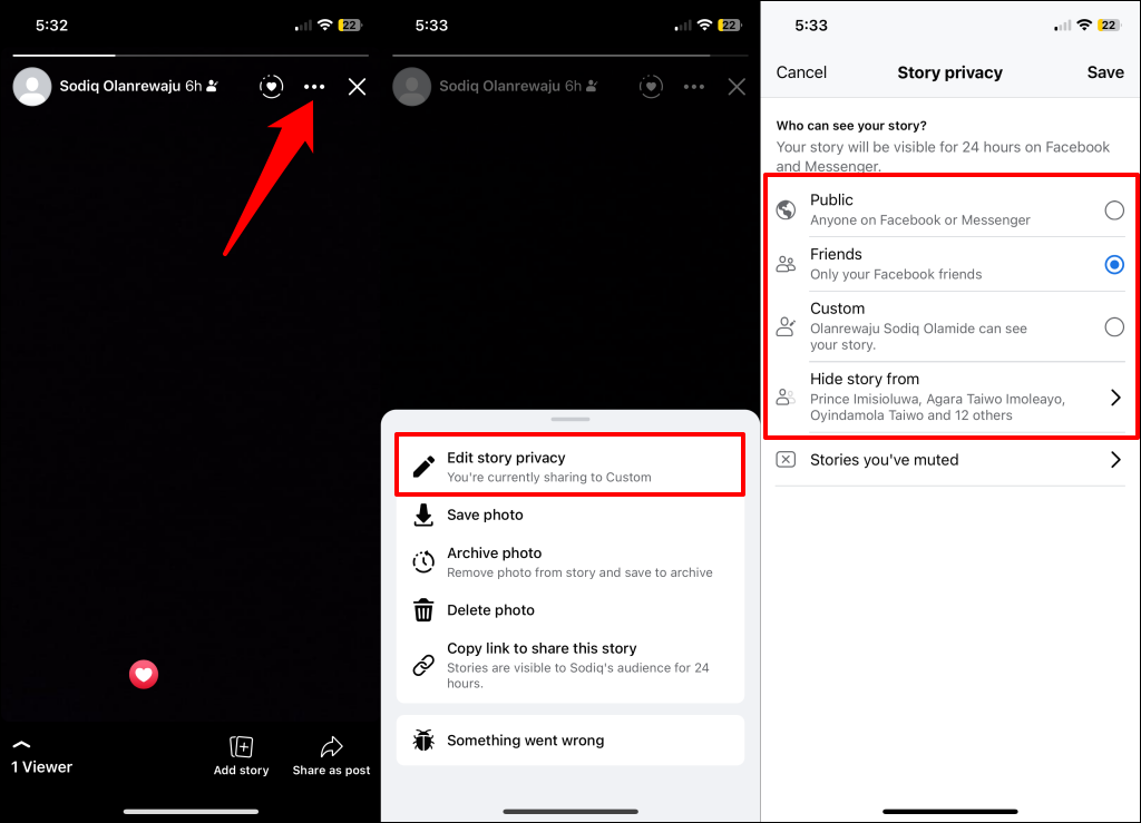 - ストーリーを開き、タップします3ドットメニューアイコン右上のコーナーで、選択しますストーリープライバシーを編集します