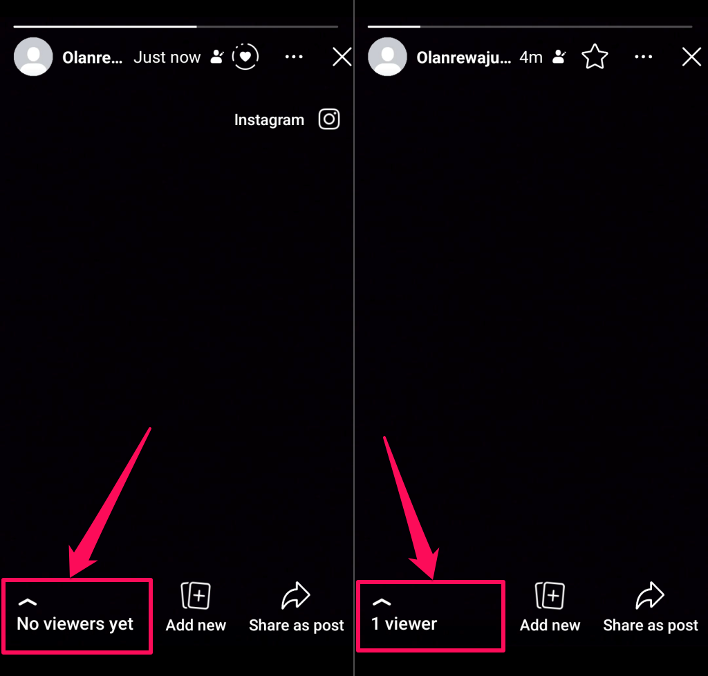 - ストーリーページ/画面の左下隅にビューカウンターが表示されます。誰もあなたのストーリーを見ていない場合、「まだ視聴者なし」メッセージが表示されます。ビューカウントをタップするか、画面をスワイプして、ストーリーを表示したすべての人をご覧ください。