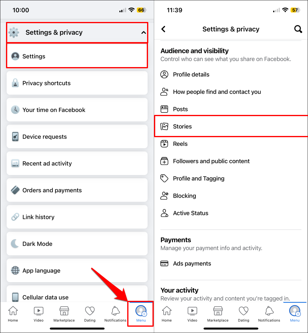 - メニューページを下にスクロールし、選択します設定とプライバシー>設定、そして選択します物語「聴衆と可視性」セクション。