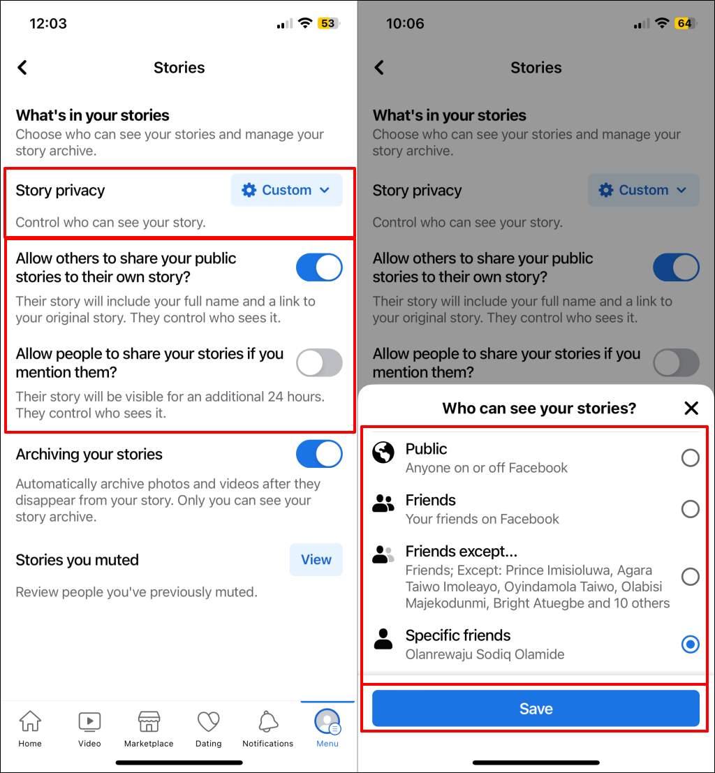 - 拡張しますストーリープライバシードロップダウンメニュー、希望する可視性オプションを選択し、選択します保存。