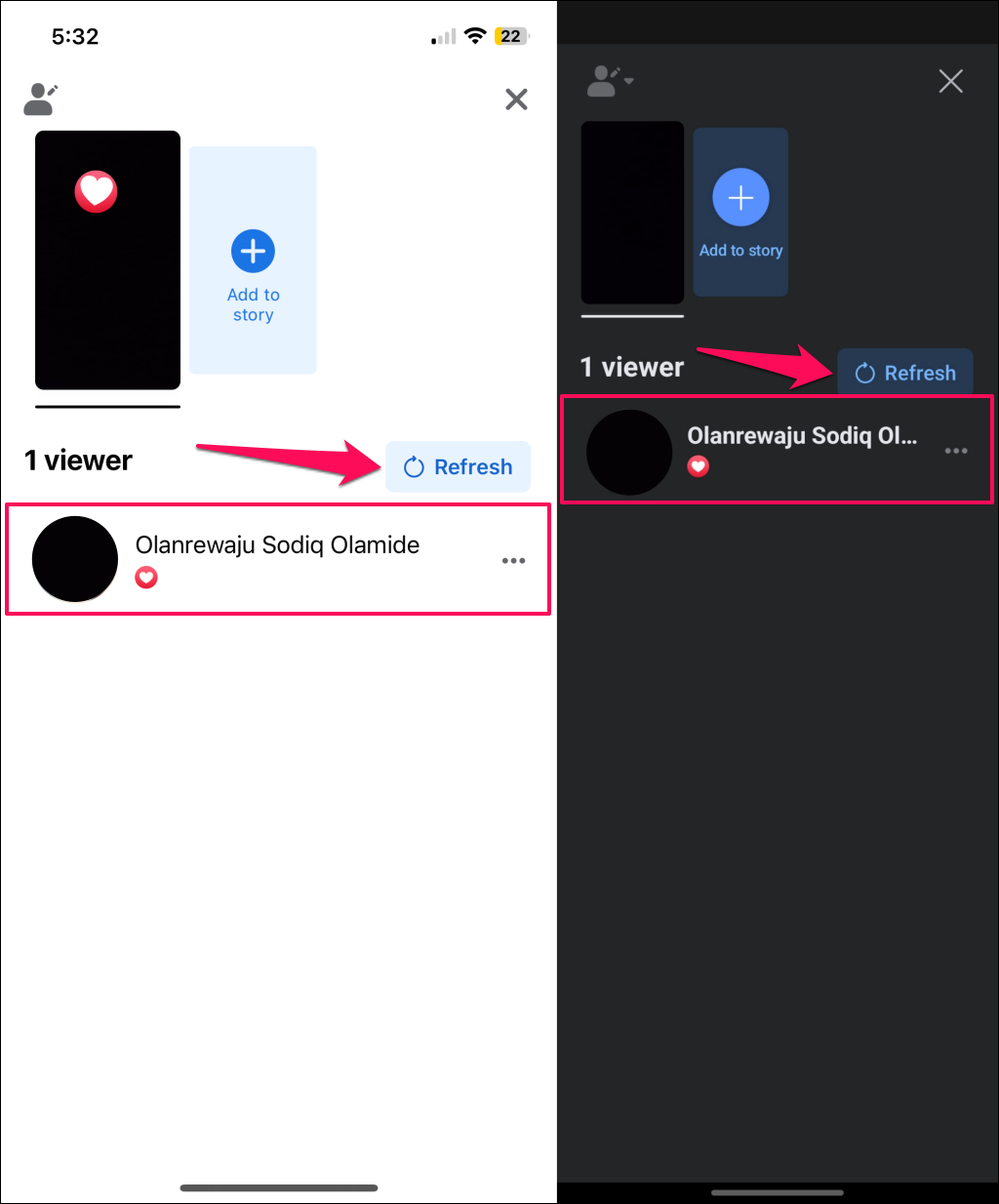- ポップアップメニューには、Facebookのストーリーを見た人の名前とプロフィール写真が表示されます。あなたの物語に反応した人々は、彼らの名前の隣に絵文字/ステッカーを持っています。タップしますリフレッシュします視聴者のリストを手動で更新するボタン。