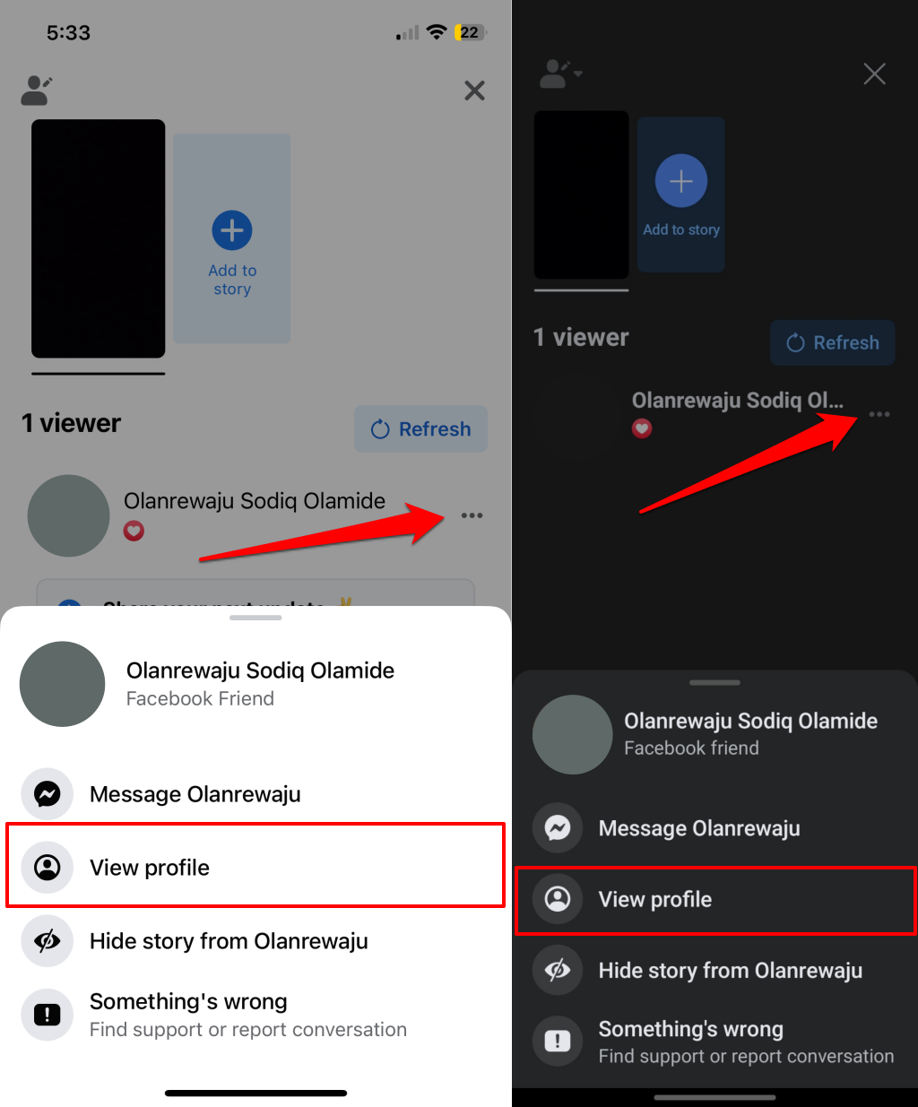 - Facebookアプリでストーリーを開き、タップしますメニューアイコン/プロフィール写真トップライト(Android)または下位(iOS)コーナー。