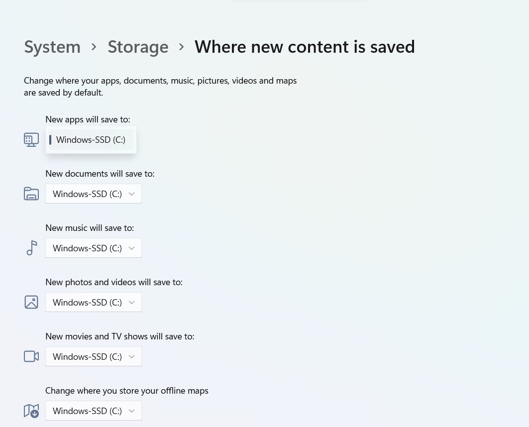 ステップ2 - ストレージ管理では、クリックします高度なストレージ設定ドロップダウンメニューを開くには。選択します新しいコンテンツが保存されていますその中に。