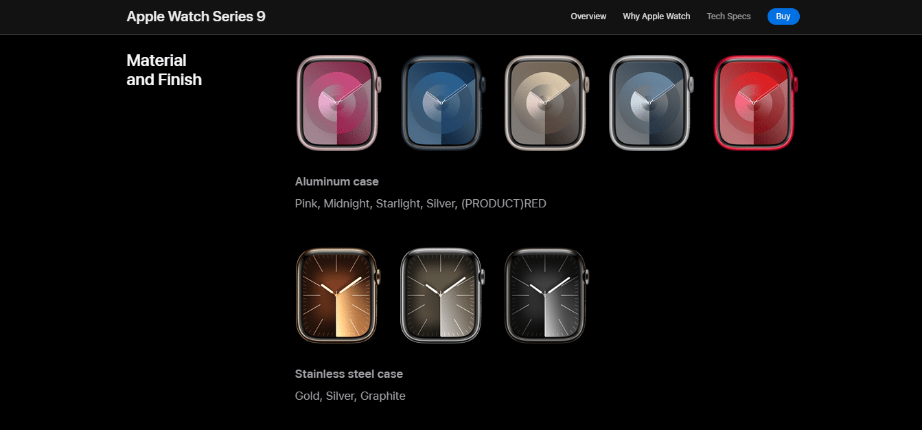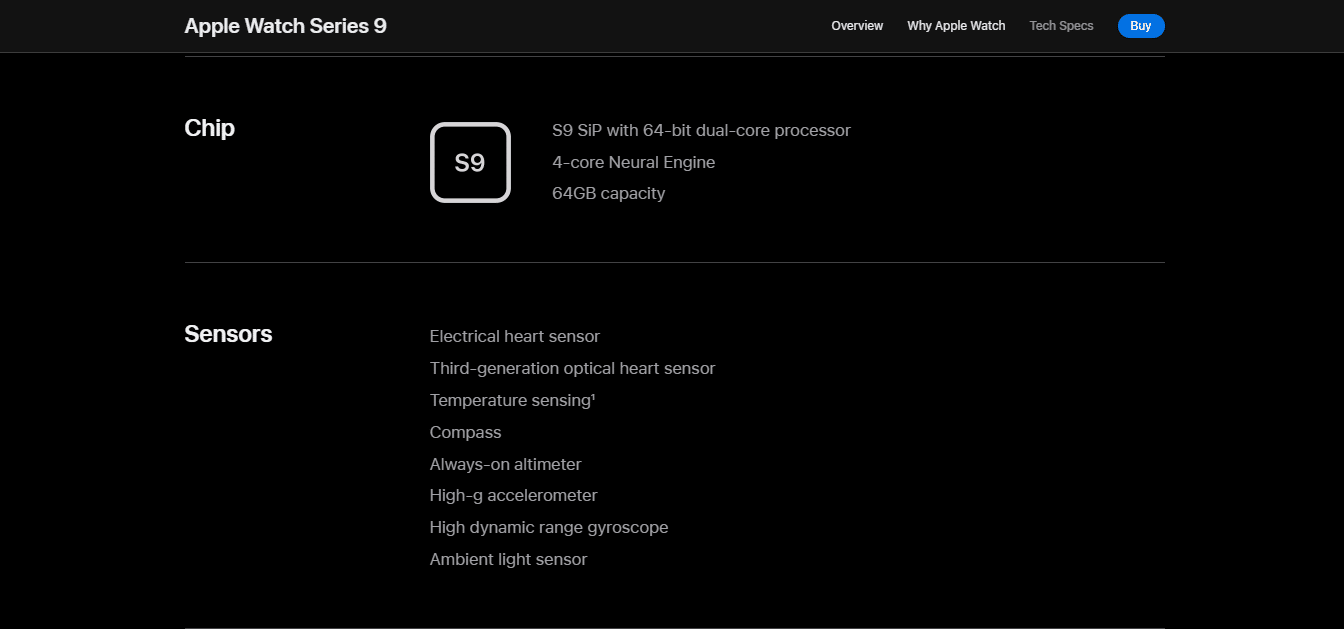 Appleは専用を導入しました技術仕様ページシリーズ9、ウルトラ2、第2世代のSEを含む最新のApple Watchのラインナップでは、統合された詳細情報の必要性を認識しています。これらのページは包括的なガイドとして機能し、材料と仕上げ、寸法と重量、ハードウェア仕様、接続オプション、バッテリー寿命の期待、健康とウェルネスの機能、安全上の機能強化、アクセシビリティオプションなど、重要な領域に関する洞察を提供します。