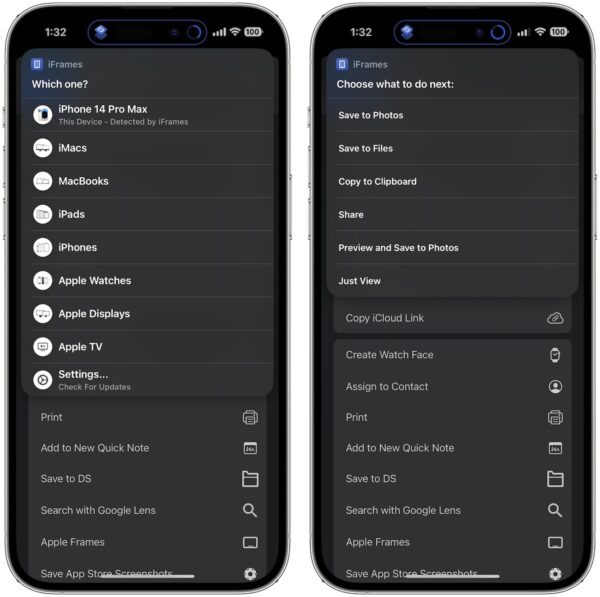 - スクリーンショットに使用するデバイスフレームを尋ねるメニューが表示されます。現在のデバイスでスクリーンショットが撮影されている場合、Iframesはそれを自動検出し、メニューの上部にオプションを表示します。または、デバイスのリストを深く掘り下げて、画像に適したデバイスを選択できます。次に、出力イメージを写真またはファイルアプリに保存し、クリップボードにコピーしたり、共有したり、プレビューして写真に保存するオプションが与えられます。