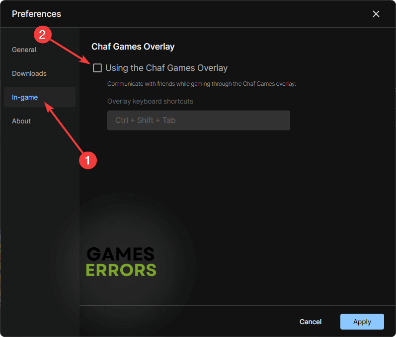 - に行きますゲーム内タブ、チェックを解除しますChaf Gamesオーバーレイを使用します。