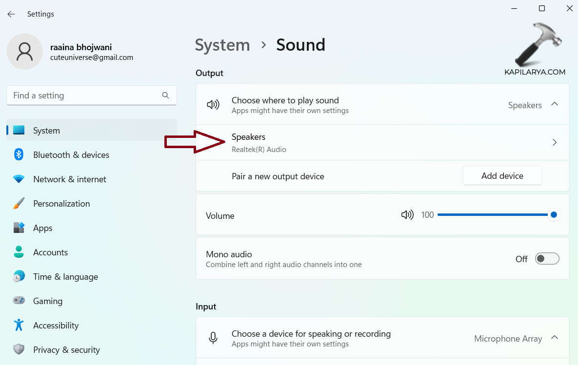 2。次に、「オーディオ入力と出力」の矢印をクリックします。