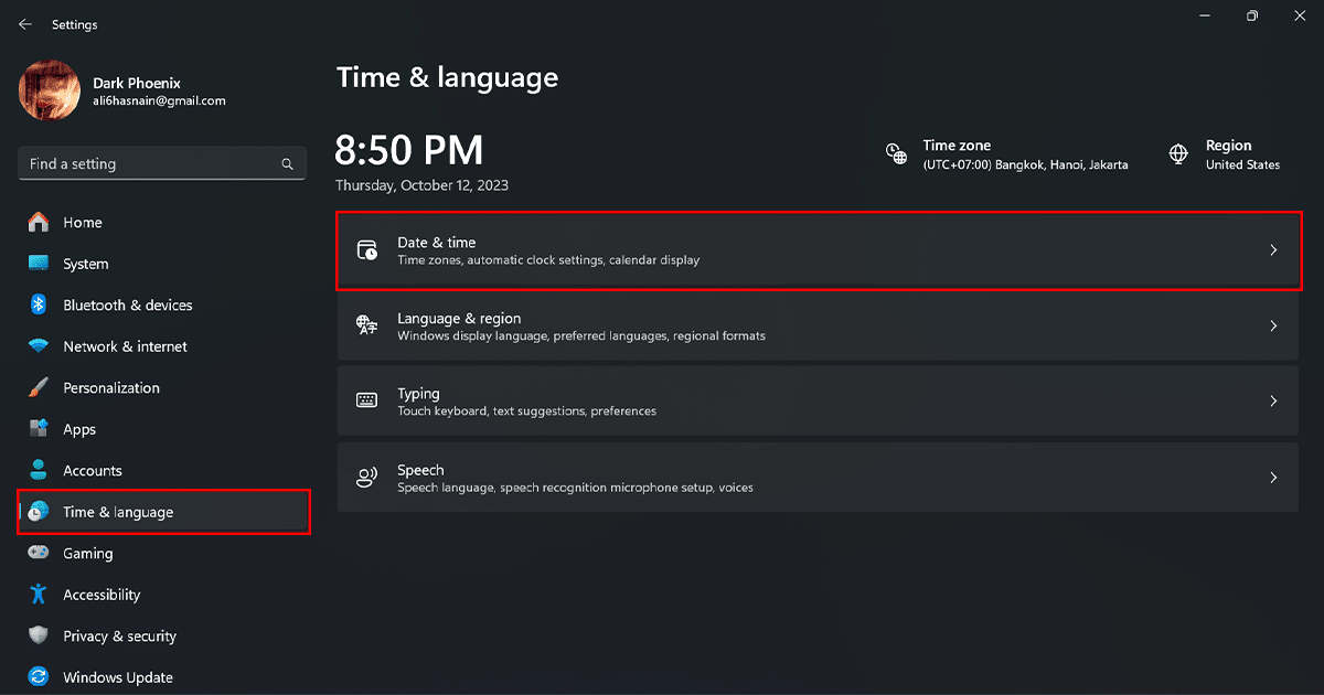 - クリックしてください時間と言語クリックしてください日付と時刻。