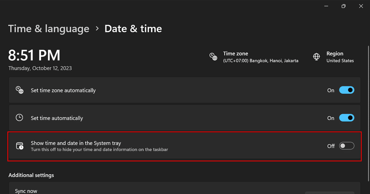 - のトグルスイッチをオフにしますシステムトレイに日時を表示します。
