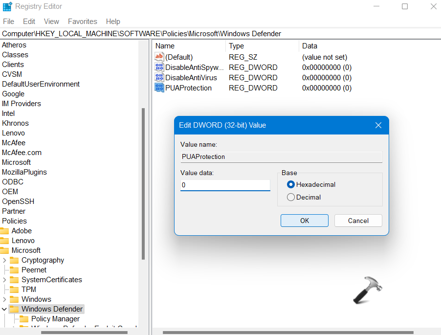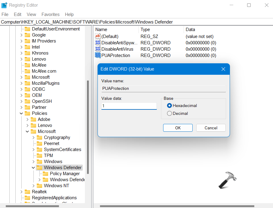 3。そこに着いたら、ダブルクリックしますPuaprotectionreg_dwordとその値データを変更します1Microsoft Defender PUA保護を有効にするため。