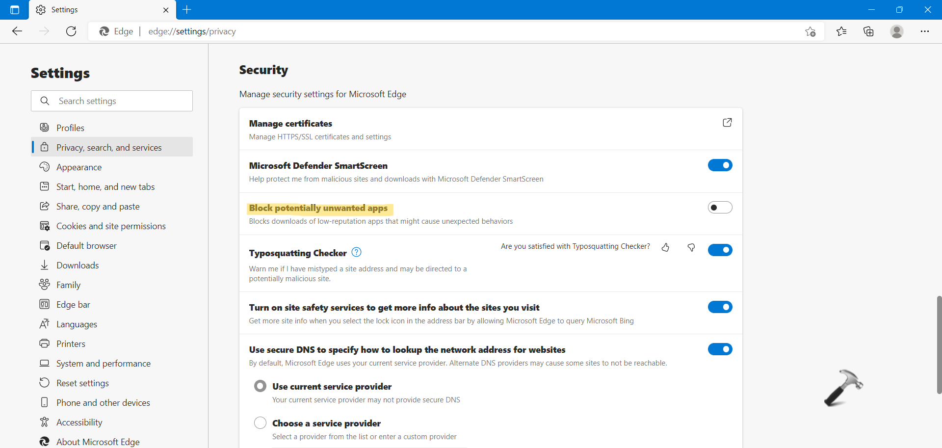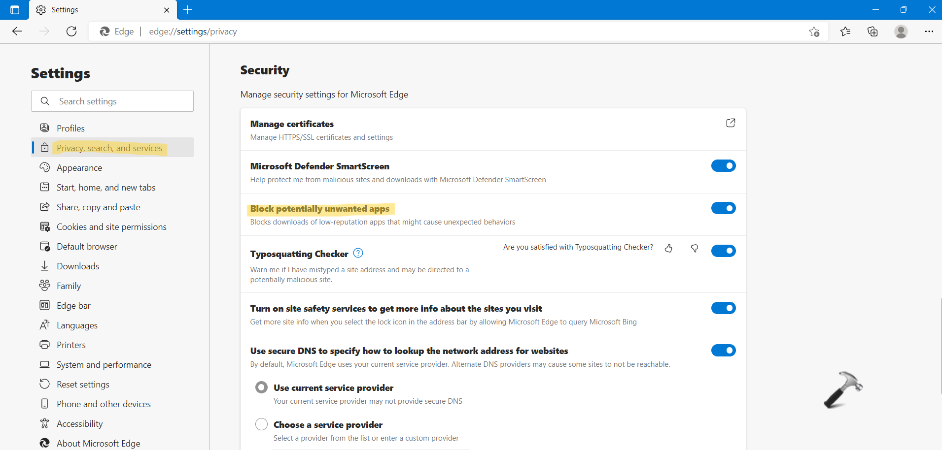 2。次に、クリックしますプライバシー、検索、サービス左側に存在します。 [セキュリティ]タブの下で、オンになります潜在的に望まないアプリをブロックしますPUA保護を有効にするため。