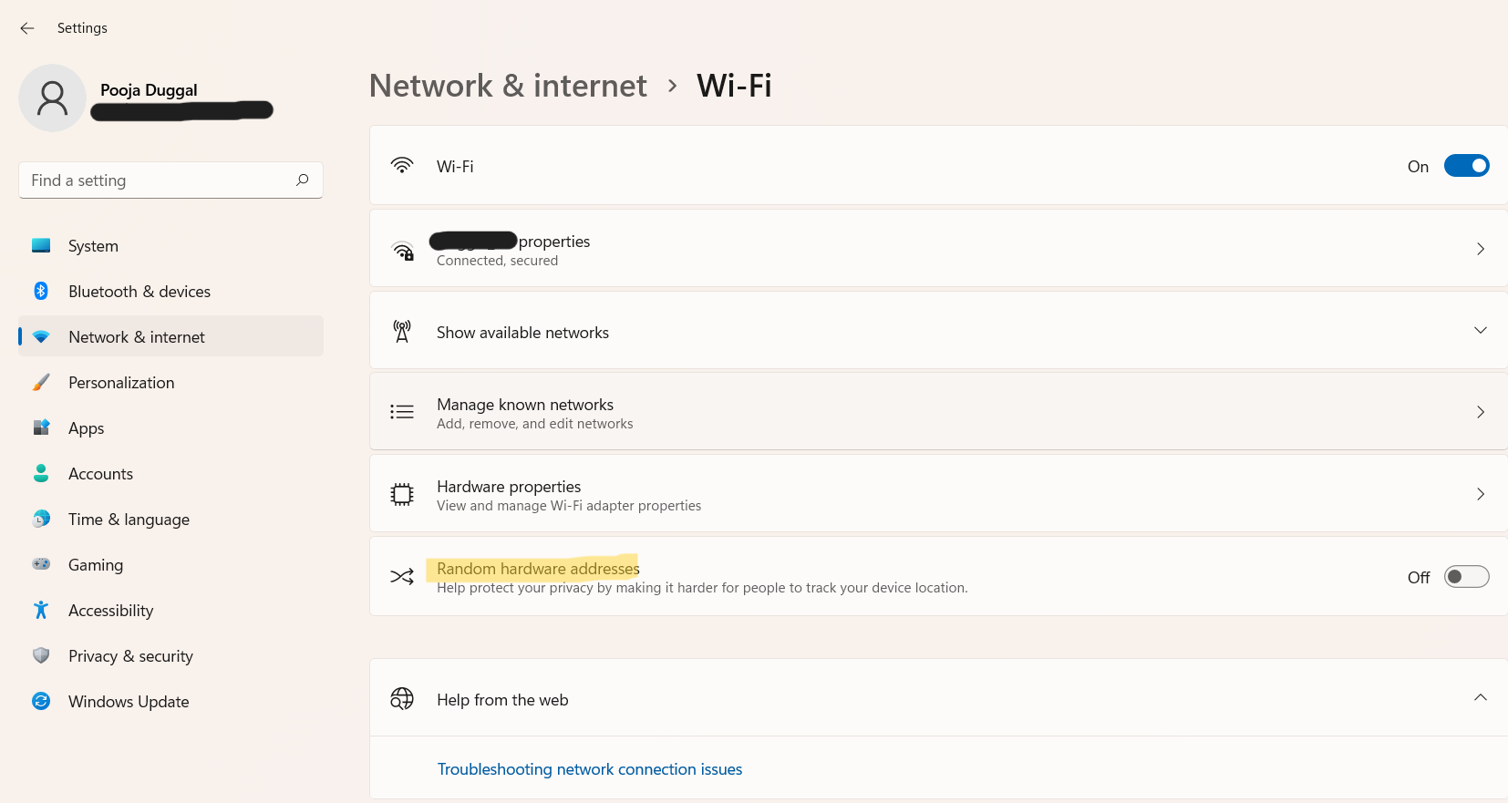 3。そこから、トグルを回しますの上有効にするランダムハードウェアアドレス。この機能を無効にするには、トグルを切り替えますオフ。