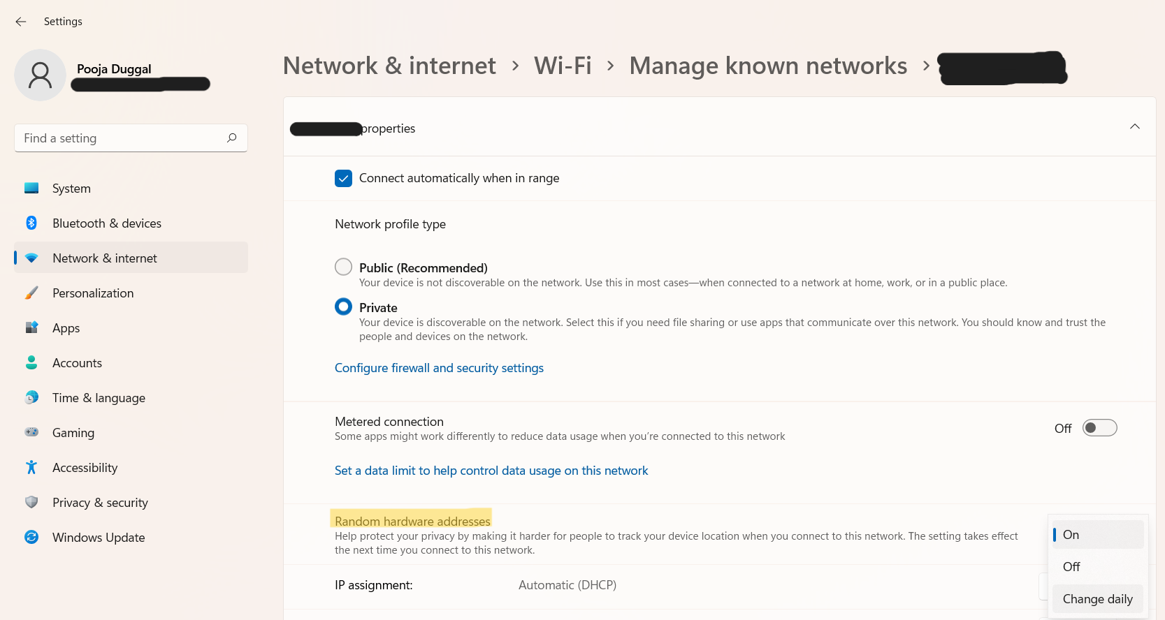 5。次のウィンドウで、選択しますの上、オフまたは毎日変更しますのドロップメニューからランダムハードウェアアドレス。