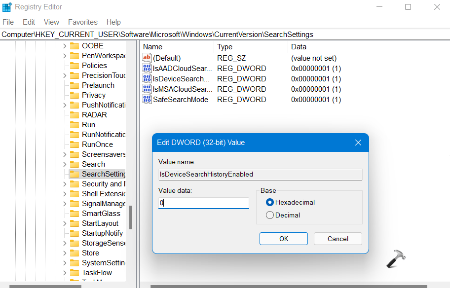 4。または、の値データを変更しますisDevicesearchHistoryEnabledreg_dword to0Windows 11の検索履歴を無効にするため。