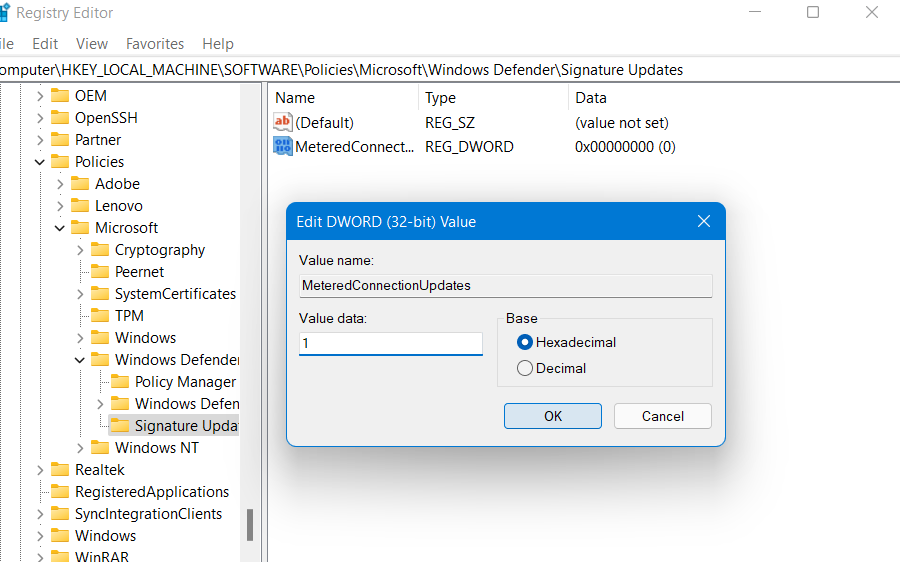 3。次に、ダブルクリックしますMeteredConnectionUpdates値データを変更します1Microsoft Defenderがメーター接続を介して更新できるようにします。