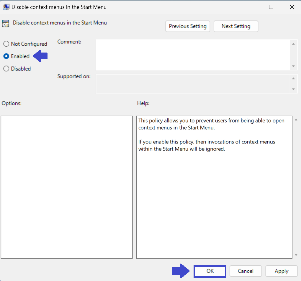 3。すべての設定で、「[スタート]メニューの「コンテキストメニューを無効にする」をクリックします。
