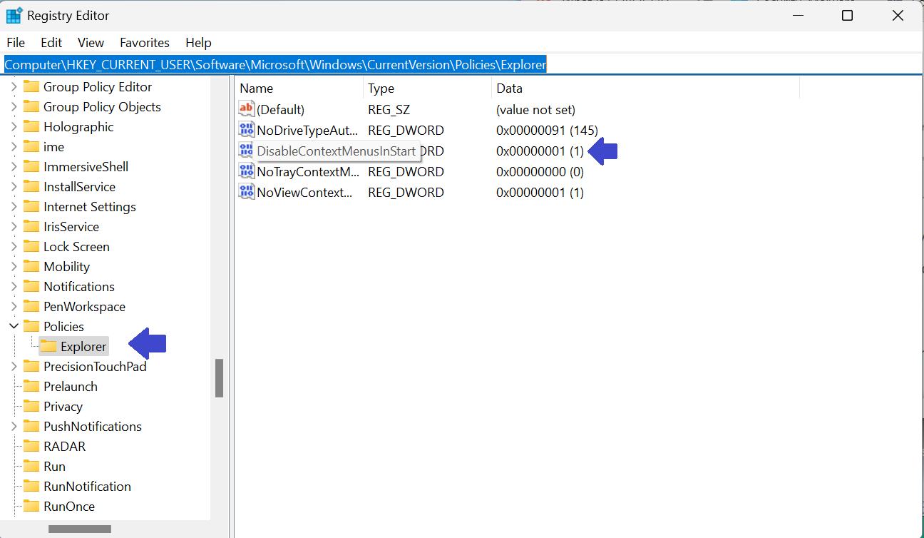 ComputerHKEY_CURRENT_USERSoftwareMicrosoftWindowsCurrentVersionPoliciesExplorer
