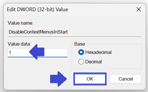 explorer => new => dWord(32ビット)値を右クリックします。タイプDisableContextMenusInStartANCをクリックしますOK。